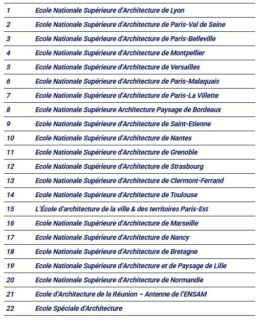 프랑스에는 총 23개의 건축학교가 있으며, 그중 20개는 문화·통신부 산하의 국립 고등 건축학교(École Nationale Supérieure d'Architecture, ENSA)입니다. 고등교육 및 연구부 산하의 'INSA', 파리의 소재한 사립 건축학교인 'ESA', 마지막으로 문화유적의 복원을 위한 '에콜 드 샤이오'(École de Chaillot)로 이루어져 있습니다. 아래는 주요 건축학교 목록과 해당 웹사이트 링크입니다.