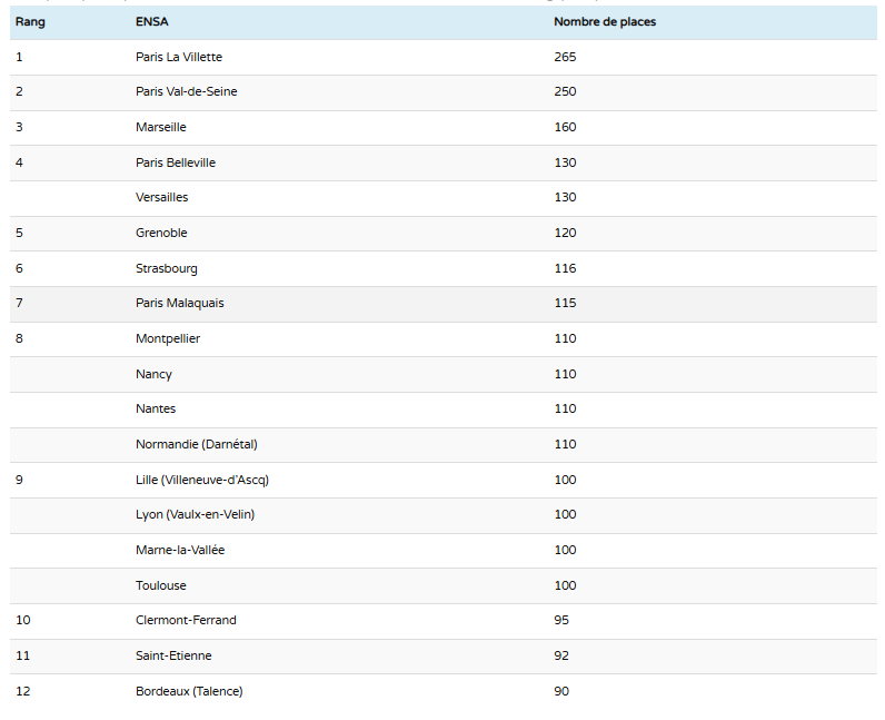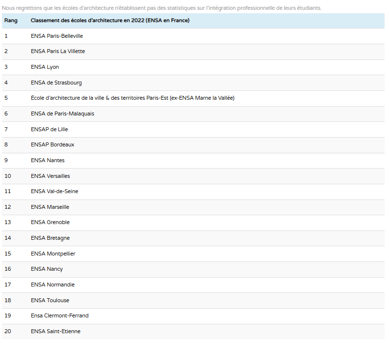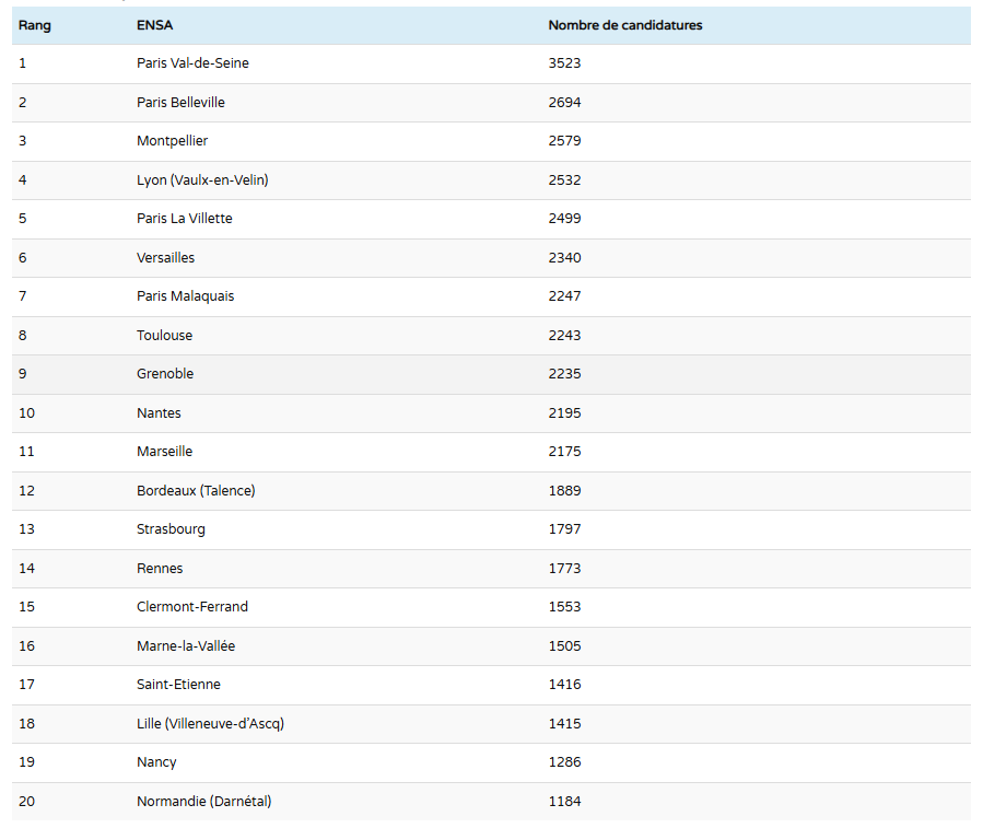 2022년 프랑스 국립 고등 건축학교 순위